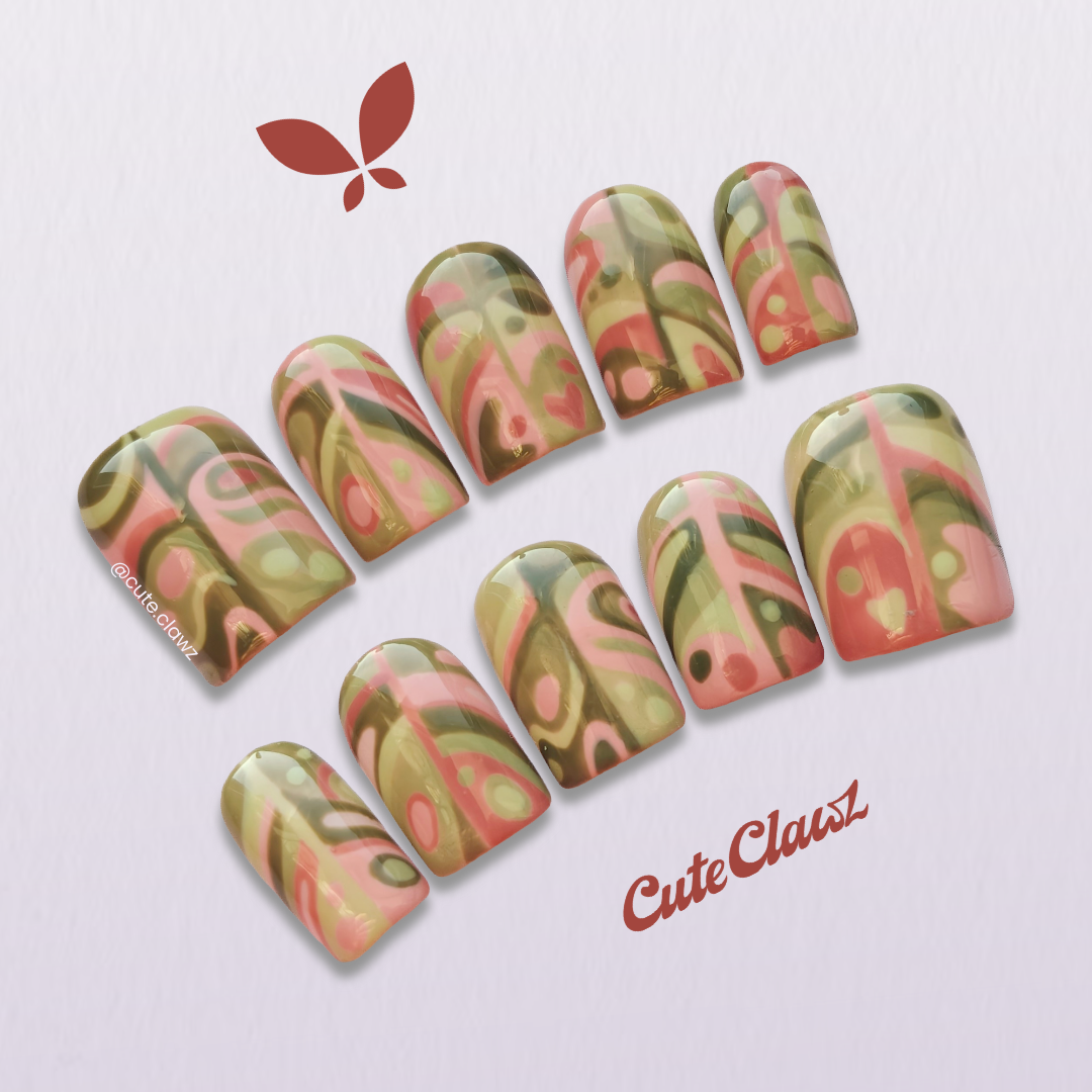 Bring a touch of tropical paradise to your fingertips with these lush Monstera Leaf nails! Featuring a cute blend of soft pink and moss green, this design captures the beauty of nature with a playful twist. Each leaf is meticulously painted, bringing life and depth to your nails, this set truly screams cottagecore!